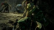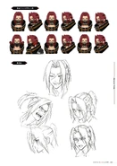 Inside the Headquarters, he can be seen wearing a a dark brown mesh shirt and brown fingerless gloves. His pants have a camouflage-pattern and he wears a little bag at the left thigh, as well as dark boots.